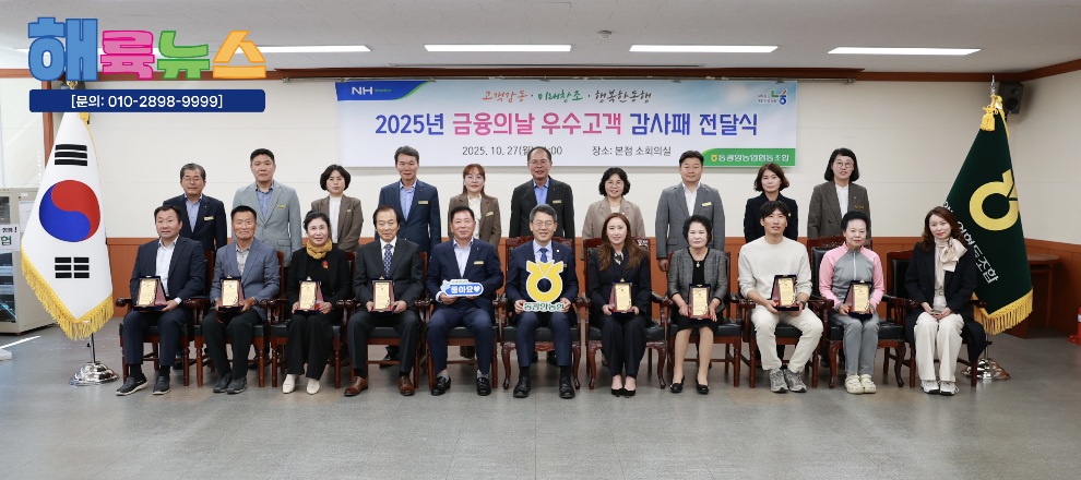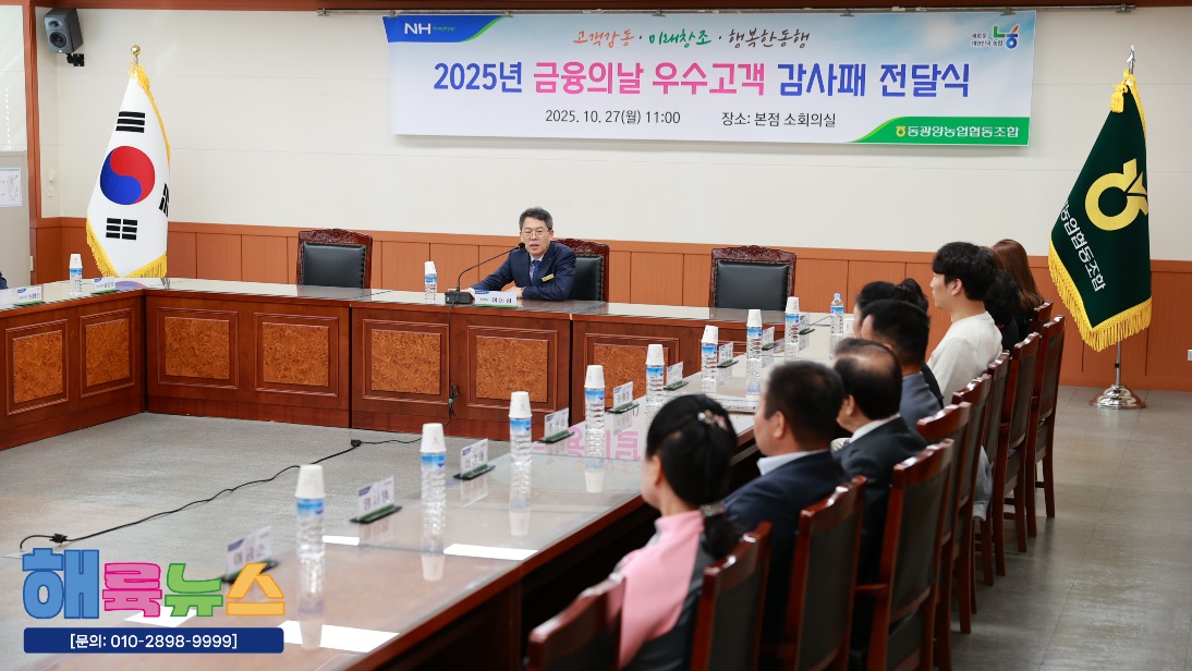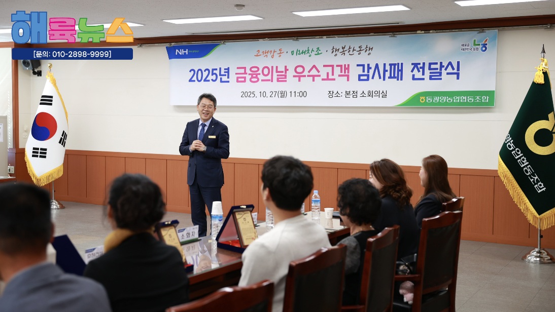 동광양농협(조합장 이돈성)은 27일 본점 소회의실에서 ‘제10회 금융의 날’을 맞아 농협을 꾸준히 이용해온 우수고객 8명에게 감사패를 전달했다.