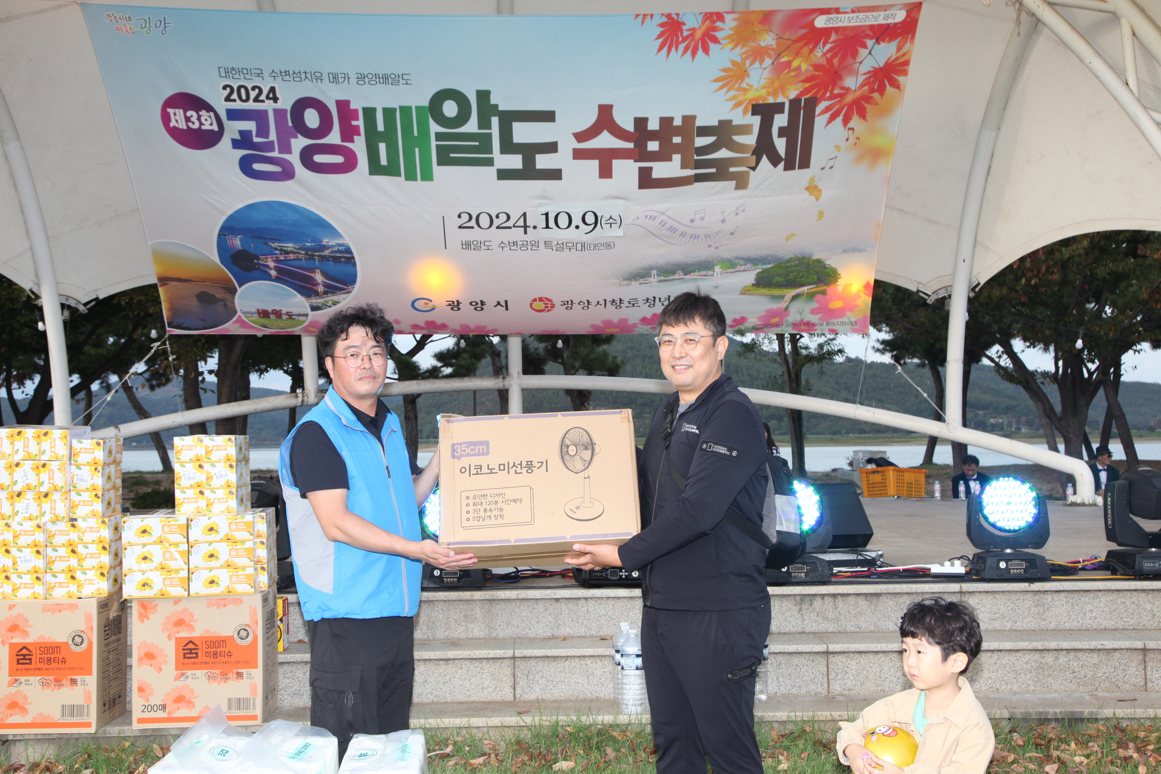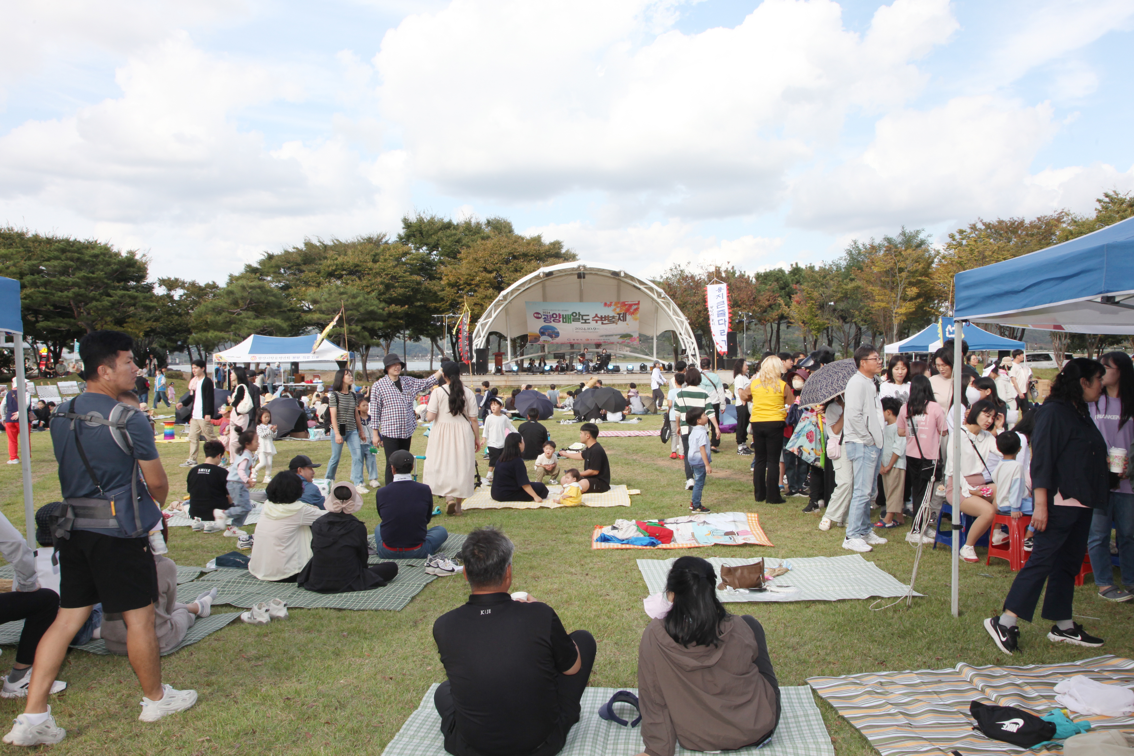 축제 현장에서는 치킨, 김밥, 김부각, 팝콘, 솜사탕, 빵, 떡 등 먹거리가 무료로 제공되고, 가족 단위 방문객을 위해 친환경 야외용 매트가 무료 제공되며, 행사 전 안전 점검을 통해 위험 요소 제거를 완료하여 참여자들이 안전하게 수변축제를 즐길 수 있도록 했다.