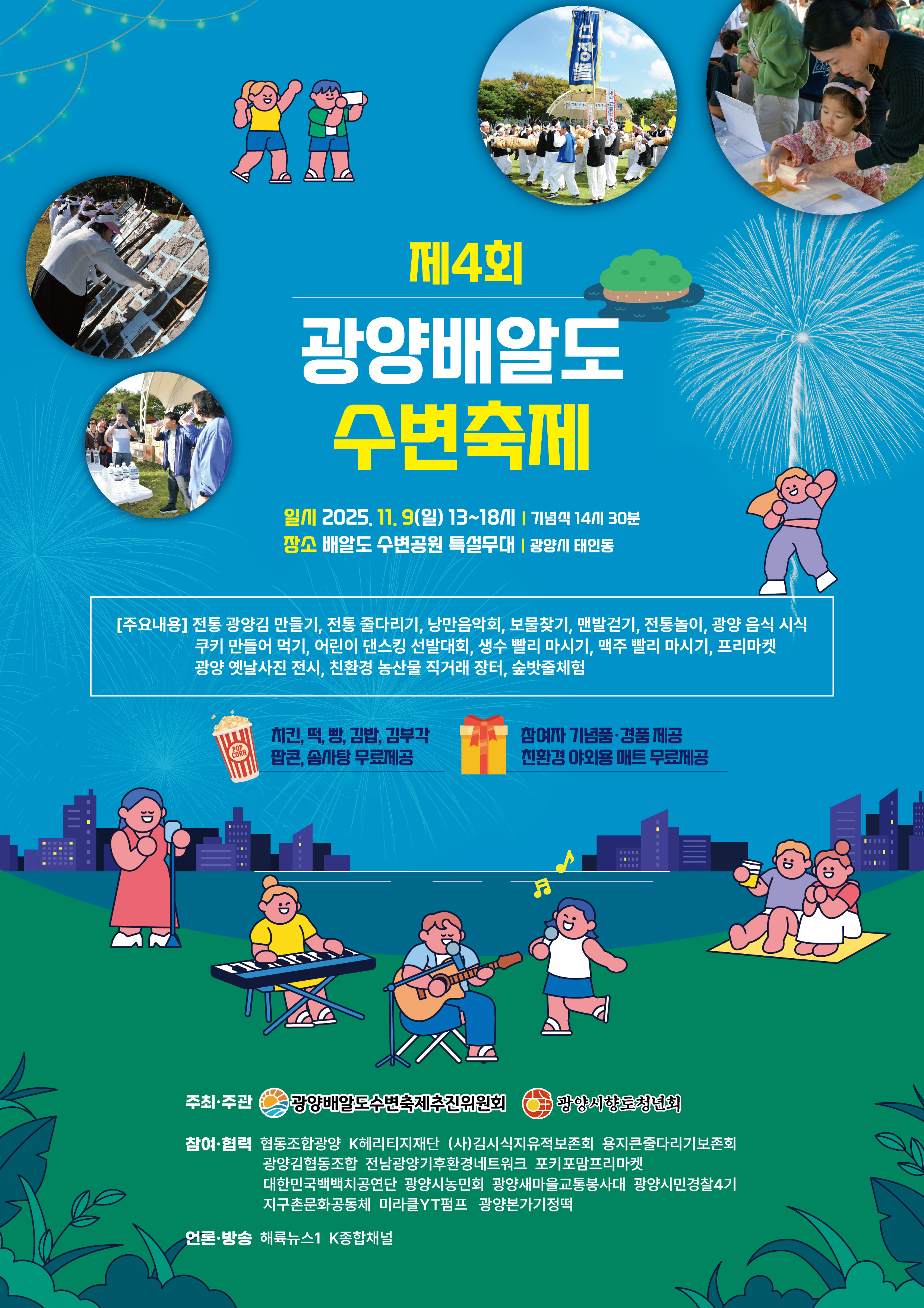 김대성 광양배알도수변축제 추진위원장은 “배알도수변공원·섬정원은 광양시민들의 대표 휴식 공간이자 관광 명소로 자리잡았다”며 “섬진강권 자연환경과 역사문화에 스며드는 축제, 유아부터 어르신까지 전연령대가 참여하는 축제, 오감이 만족하고 행복을 주는 축제를 추진방향으로 축제를 준비했다”고 밝혔다.