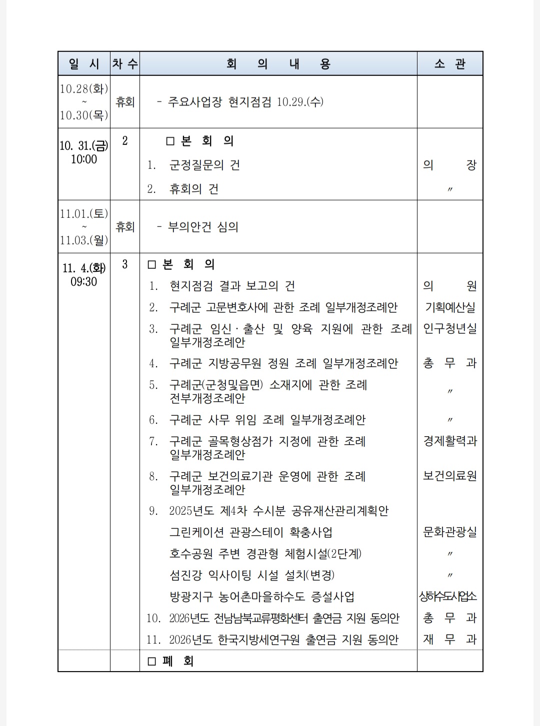 아울러 10월 31일 오전 10시에 개의하는 제2차 본회의에서는 군정질문이 진행된다. 군수에게 일문일답 형식으로 군정 전반에 대해 질의하고 답변을 청취하여, 군정의 주요 현안과 향후 정책 방향을 점검할 예정이다.