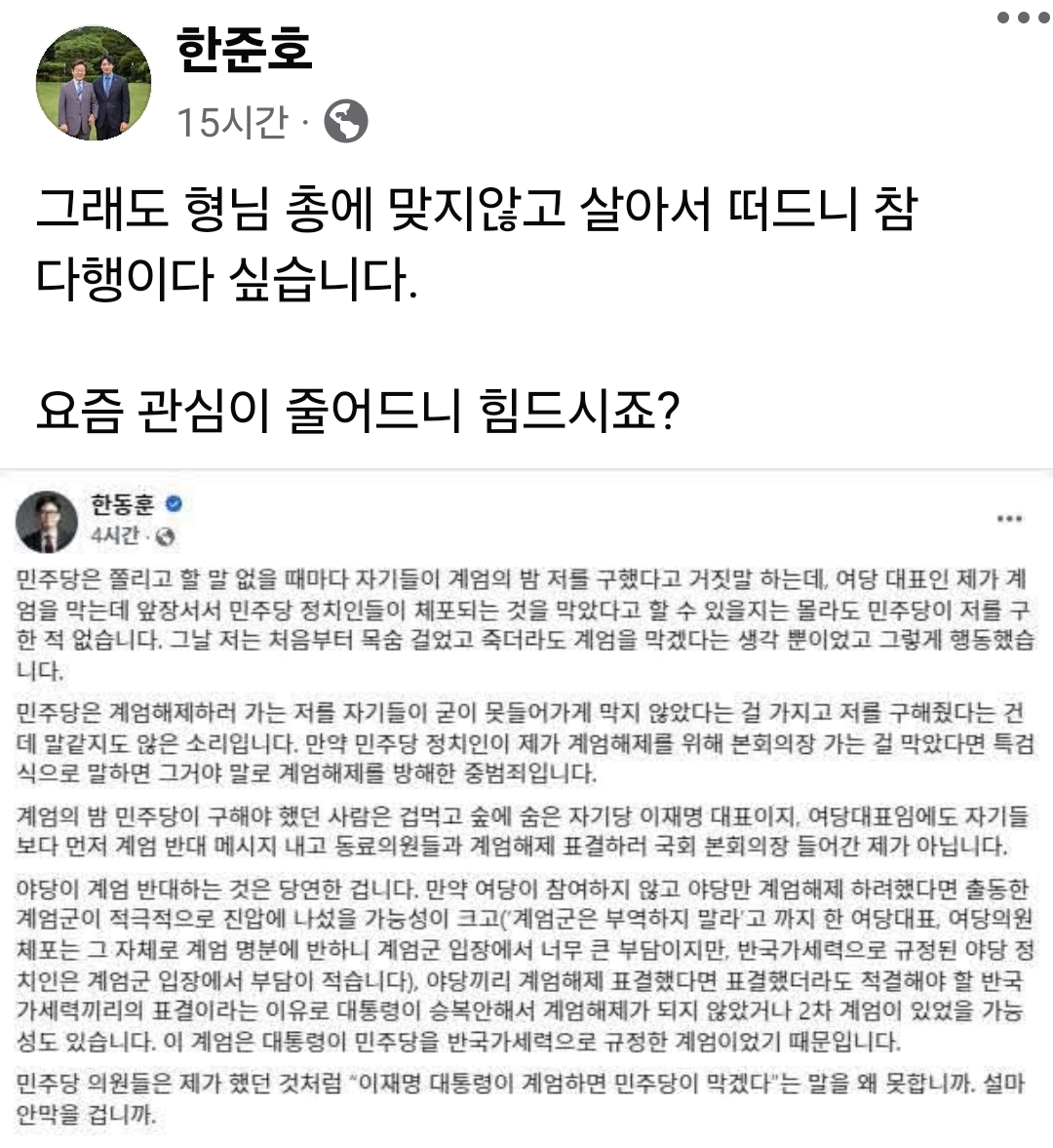 이는 앞서 한 전 장관이 “민주당은 내가 계엄 해제를 막았다고 거짓말한다”며 민주당을 비판한 데 대한 반응으로 해석된다.