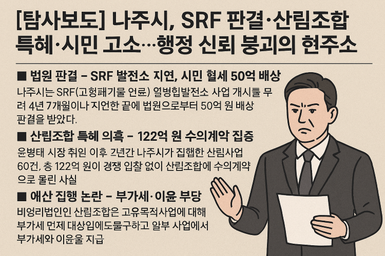 ■ SRF 발전소 지연, 시민 혈세 50억 배상 판결 나주시는 SRF(고형폐기물 연료) 열병합발전소 사업 개시를 4년 7개월간 지연한 책임으로 법원으로부터 50억 원 배상 판결을 받았다. 재판부는 “정당한 사유 없이 사업 개시 신고를 반려한 것은 불합리하다”고 판시했다. 행정 판단의 근거와 기록, 리스크 관리가 부실했다는 점이 드러난 셈이다. 현재 추가 손해배상 소송도 진행 중이며, 시민 부담은 더 커질 수 있다.