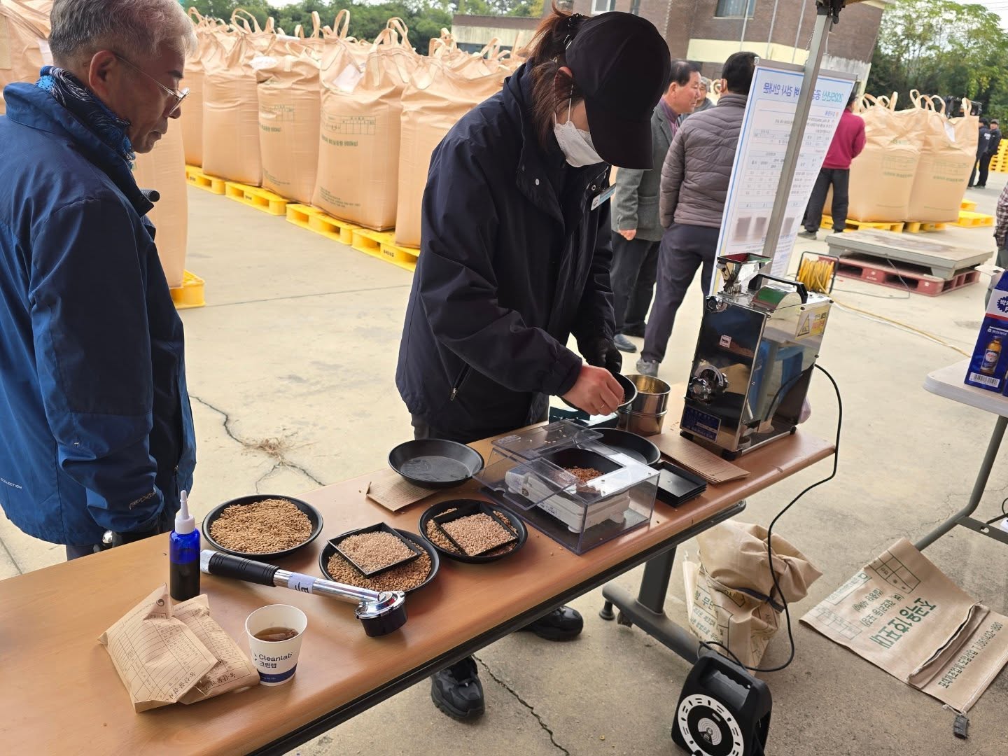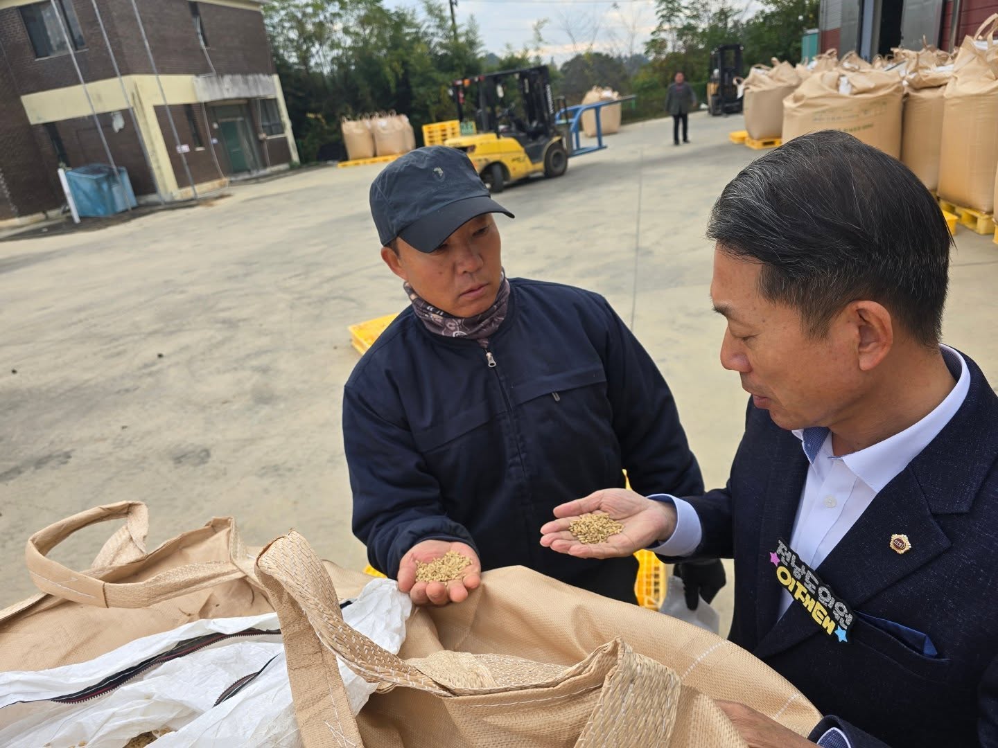벼 포대가 줄지어 놓인 수매장. 이재태 도의원은 농민들과 함께 벼 품질을 직접 확인하며 “올해는 잦은 재해와 생산비 상승으로 어느 해보다 힘든 농사였다. 하지만 농민들의 땀은 여전히 고귀하다”고 말했다.
