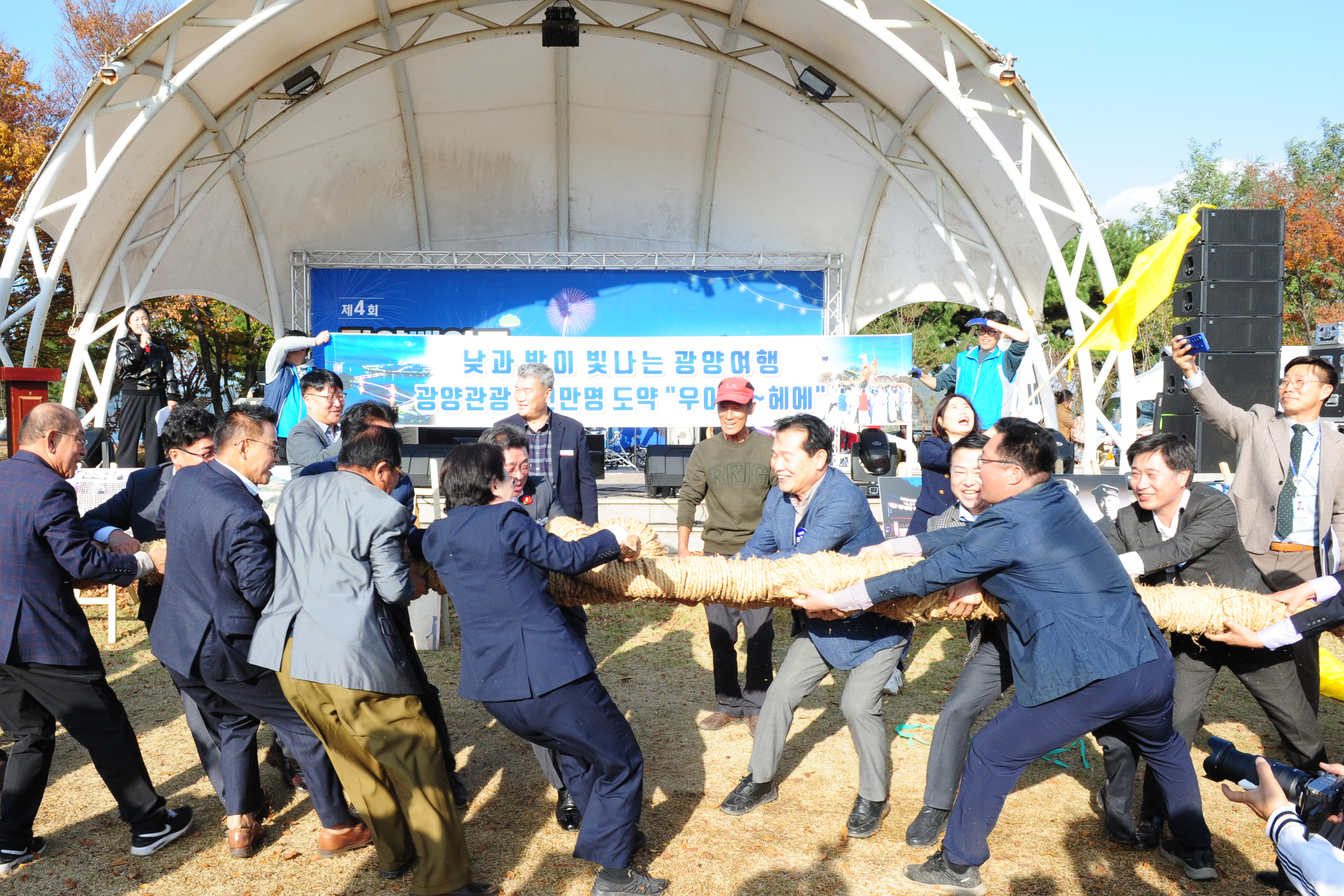 특히, 1642년 김 창안가 김여익이 세계 최초로 김을 발견한 배알도 수변공원에서 '김 풍작 기원' 전통민속놀이 용지큰줄다리기를 활용한 ‘낮과 밤이 빛나는 광양여행, 광양관광 1천만명 도약’ 줄다리기 퍼포먼스는 방문객의 시선을 사로잡았다.