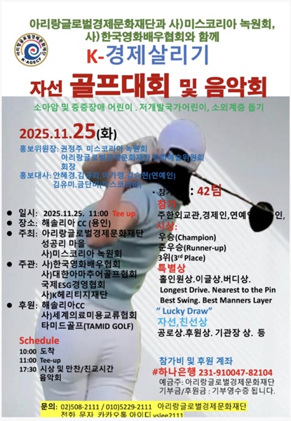 아리랑글로벌경제문화재단(회장 이용수)는 성공리 마을(이장 김재덕)과 오는 11월 25일 오전 11시부터 용인 해솔리아CC에서 소외계층 아동 지원을 위한 ‘K-경제살리기 자선 골프대회 및 음악회’를 개최한다고 밝혔다.