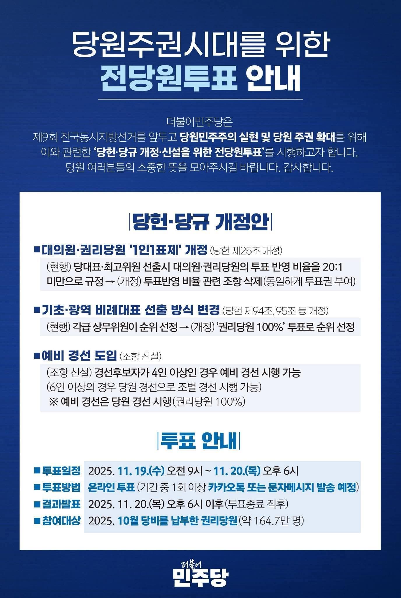 참여 대상은 2025년 10월 당비를 납부한 권리당원 약 164만7천 명이며, 결과는 20일 오후 6시 이후 투표 종료 직후 발표된다.
