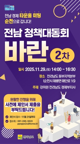 전라남도는 29일 동부지역본부에서 경제 타운홀 미팅인 ‘전남 청책대동회 바란(2차)’을 개최키로 하고 21일...