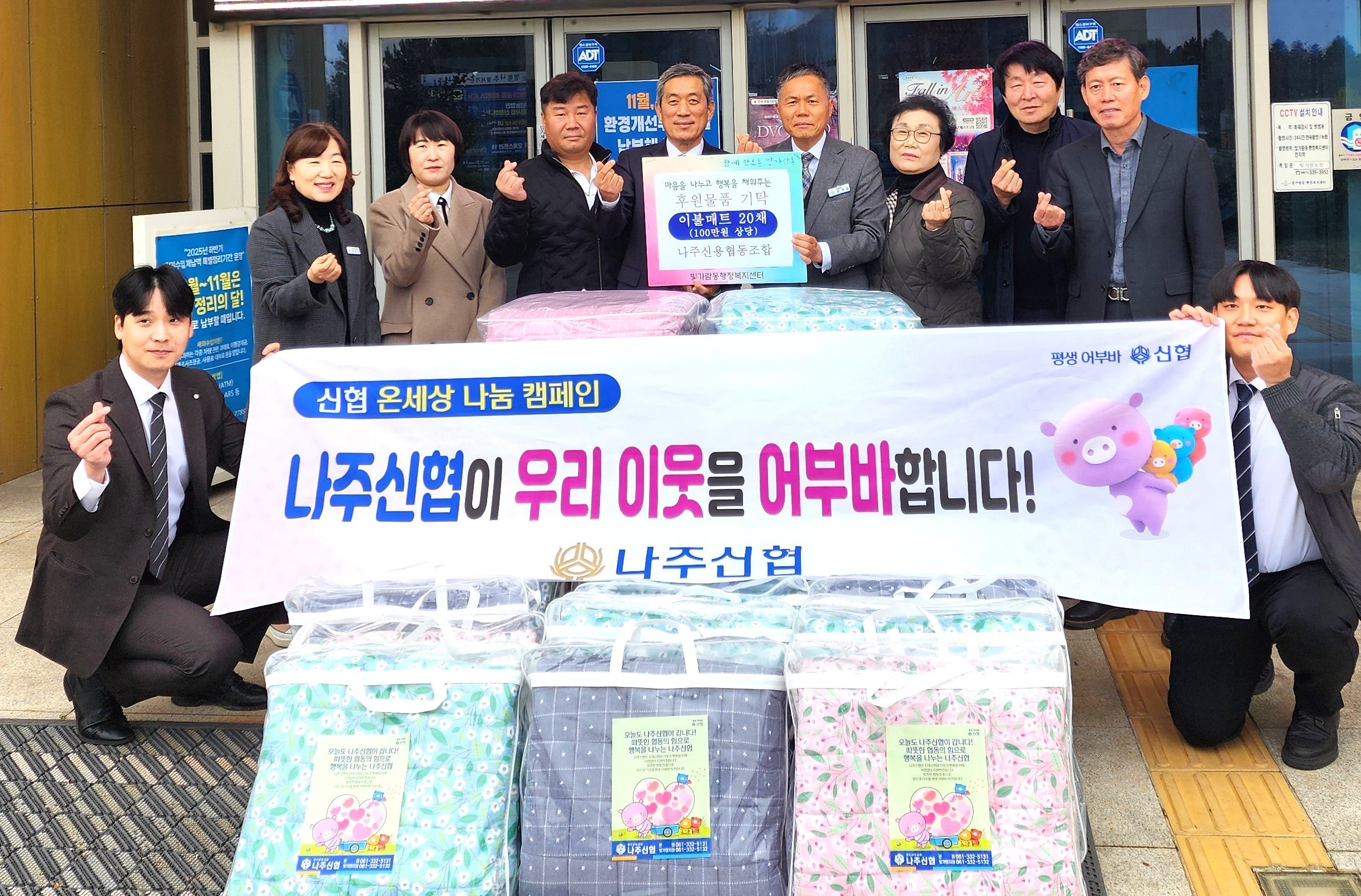 이날 행사에는 나주신협 임직원과 빛가람동 관계자들이 함께 자리해, 지역사회 나눔의 의미를 되새겼다. 특히 행사 현장에는 ‘우리 이웃을 어부바합니다!’라는 문구가 적힌 현수막과 함께 형형색색의 이불 매트가 진열돼, 나눔의 온기를 시각적으로도 전했다.