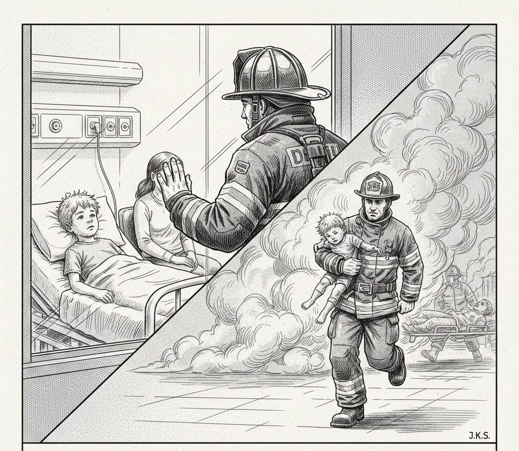 초겨울의 공기는 차갑고, 도시의 골목은 조용합니다. 그러나 그 적막한 풍경 속에도, 우리는 꺼지지 않는 불빛을 봅니다. 그 불빛은 병원 복도에서 아픈 아이를 바라보는 소방관의 눈빛 속에, 불길 속에서 아이를 품에 안고 뛰는 그들의 발걸음 속에, 그리고 독거노인의 창가, 고시촌의 좁은 방, 응급실의 침대 곁에 조용히 타오르고 있습니다.