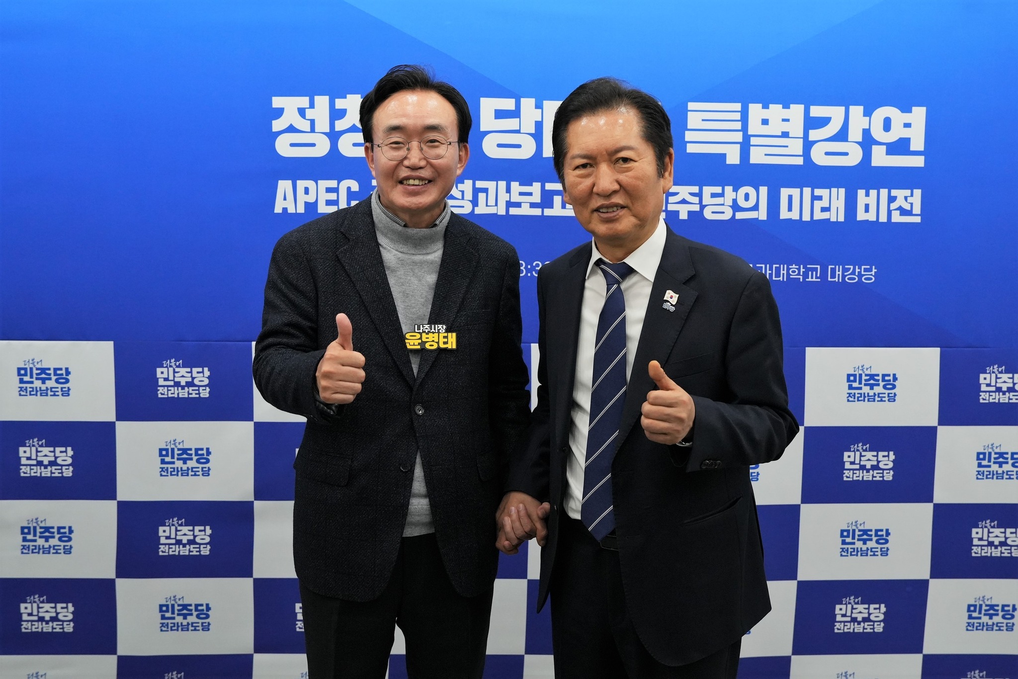정청래 당대표는 이날 한국에너지공과대학교에서 열린 ‘APEC 국민 성과 보고 및 민주당의 미래 비전’ 특별강연을 마친 뒤, 나주곰탕으로 저녁식사를 함께하며 전남 시장·군수들과 지역 현안에 대한 깊이 있는 대화를 나눴다. 이어 빛정원 페스타 현장을 직접 둘러보며 시민들과 기념사진을 찍고, “광주·전남 공동 혁신도시는 국가균형발전의 심장”이라며 나주에 대한 애정을 드러냈다.