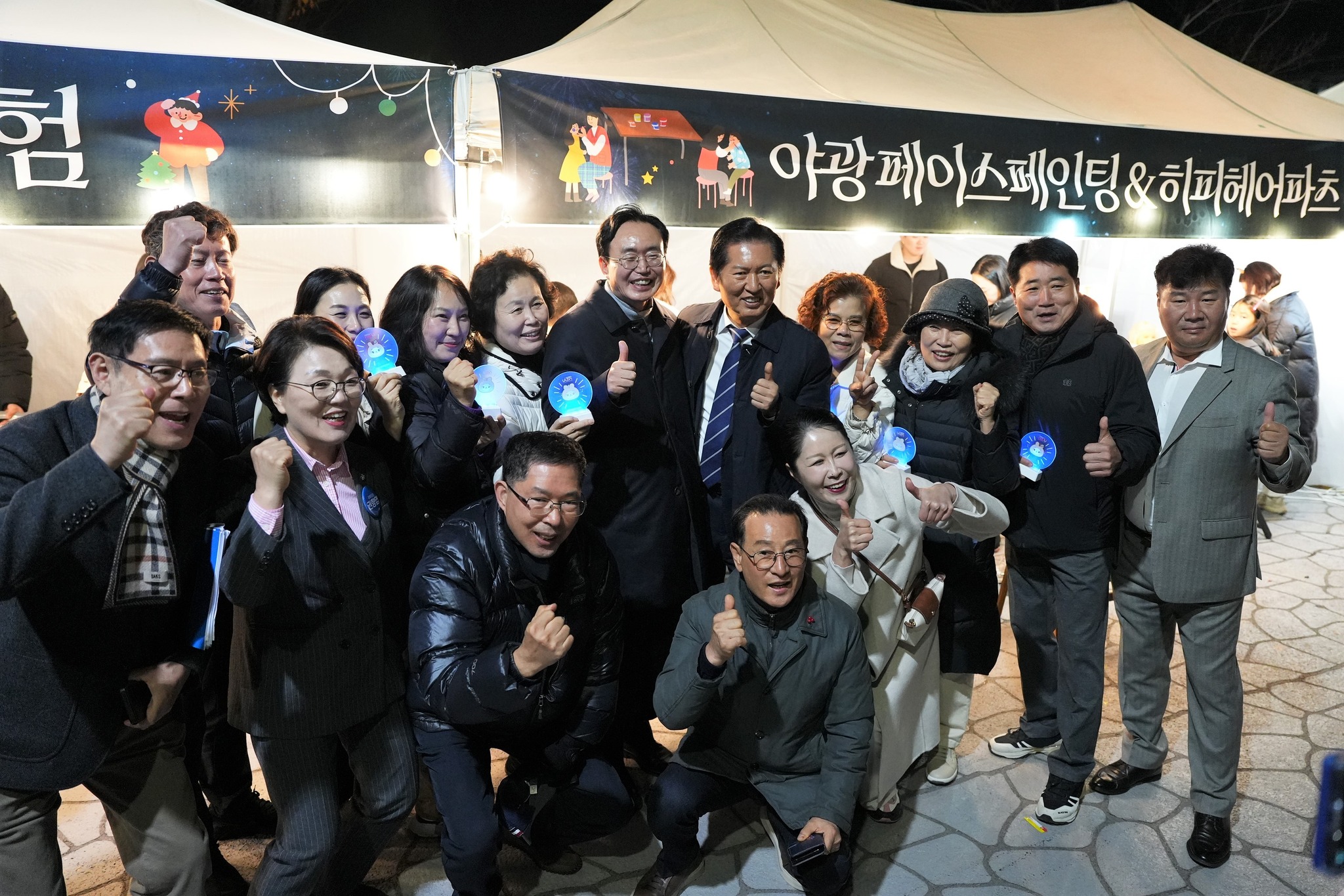 사진 설명 윤병태 나주시장과 정청래 더불어민주당 당대표가 빛가람 빛정원 페스타 현장에서 시민·지역 소상공인들과 함께 기념촬영을 하며 나주의 밤을 환하게 밝히고 있다. (사진: 나주시청 홍보팀 제공)