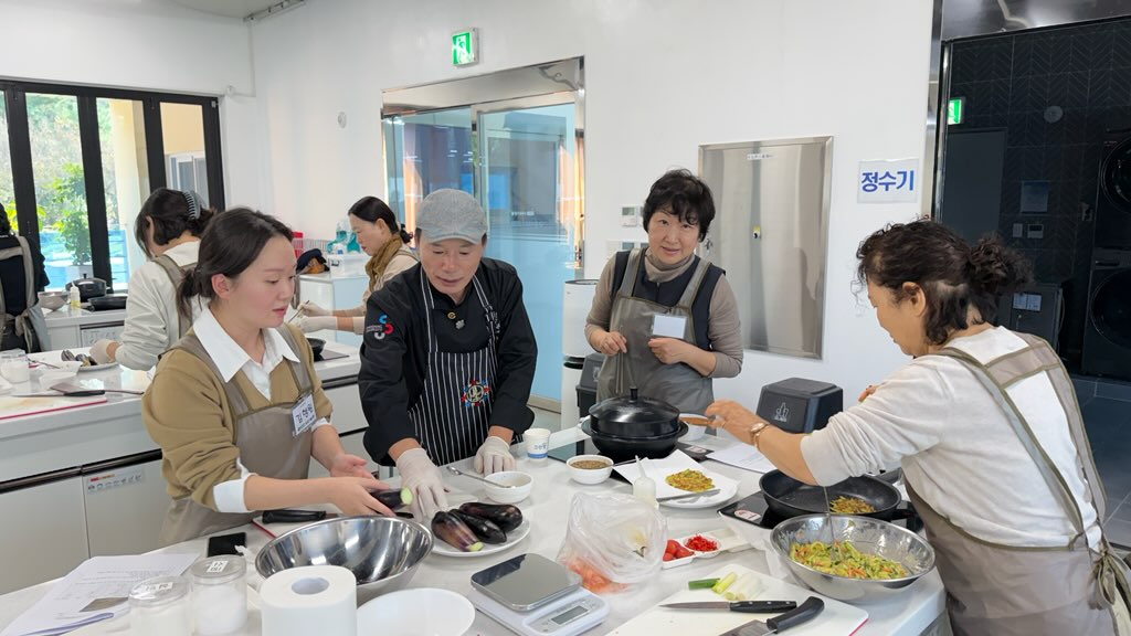 사진 2 함평군이 주최한 요리 체험 프로그램에서 주민들이 앞치마를 두르고 직접 요리를 실습하는 모습. 채소 손질과 조리 과정에 집중하며 즐거운 분위기를 자아낸다. 사진제공: 함평군 홍보팀
