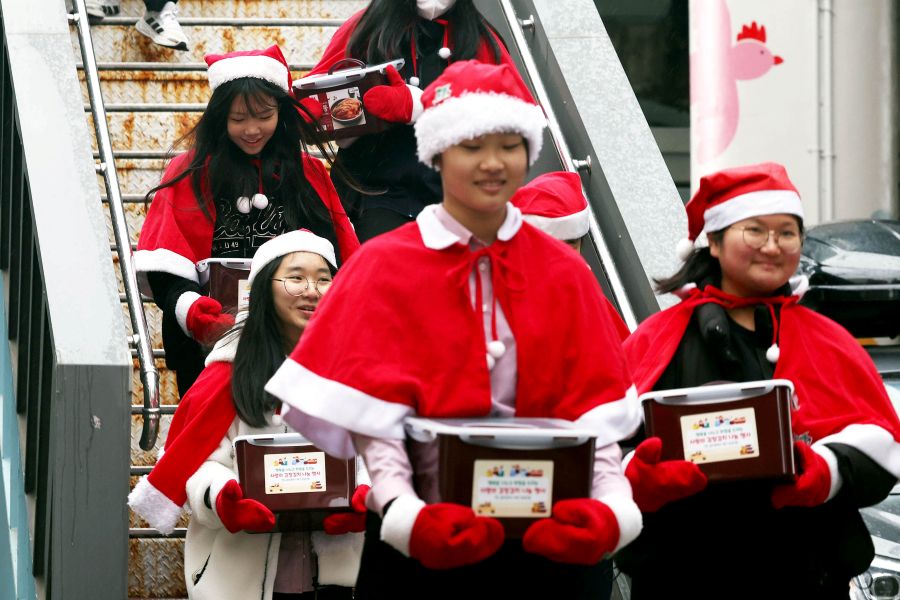 2. 산타 복장 나눔 행사 산타 복장을 입은 자원봉사자들이 선물 상자를 들고 계단을 내려오며 연말 나눔 행사를 펼치고 있다. 밝은 표정의 참가자들이 이웃에게 따뜻한 마음을 전하는 모습이 인상적이다.(북구청 사진제공)