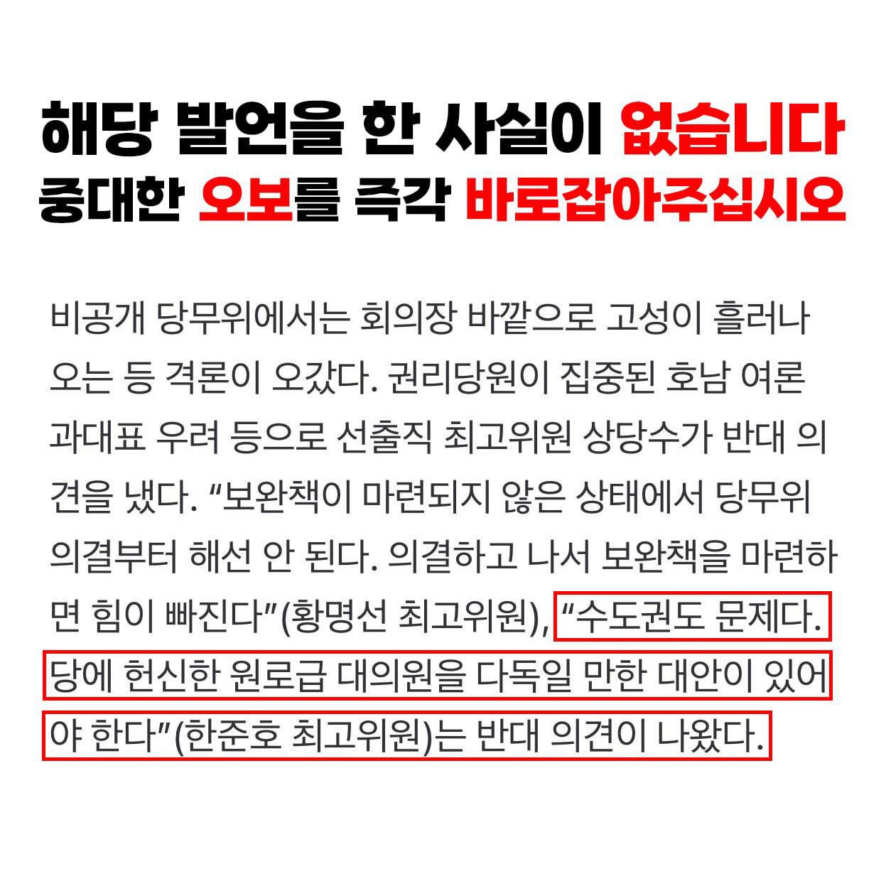 그러나 이번 사안과 관련한 허위 보도는 용납하기 어렵다고 지적했다. 그는 “의사결정 과정에서 신중한 의견을 냈다는 이유로, 하지도 않은 발언이 ‘사실’인 것처럼 둔갑하는 것은 같은 당원 동지를 향해 할 행동이 아니다”라며 “누가 민주당을 흔들고 있는지 돌아볼 때”라고 했다.