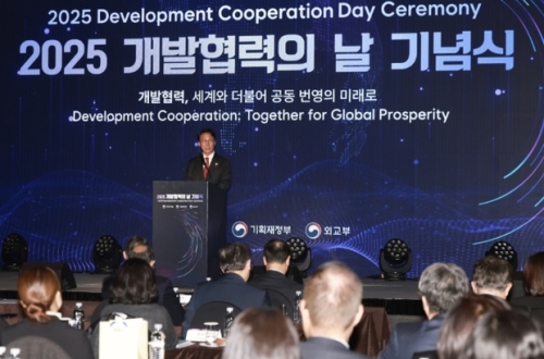김민석 국무총리가 25일 중구 플라자호텔에서 열린 개발협력의 날 기념식에 참석, 기념사를 하고 있다. 정부는...