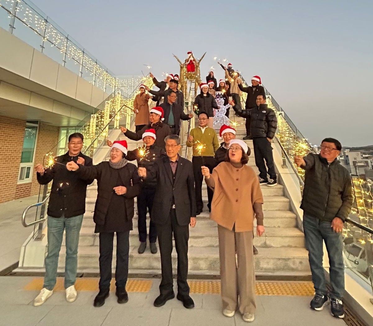 사진 설명 함평겨울빛축제’ 성공 기원 점등식이 어울림커뮤니티센터에서 열려 지역 주민과 관계자들이 함께 조형물 앞에서 기념촬영을 하고 있다. 맨 앞줄 오른쪽 두 번째는 정화자 함평읍장. 사진 속 청사 외벽은 산타, 루돌프 등 크리스마스 조형물과 조명이 어우러져 따뜻한 겨울 분위기를 자아낸다. (사진제공=화순군)