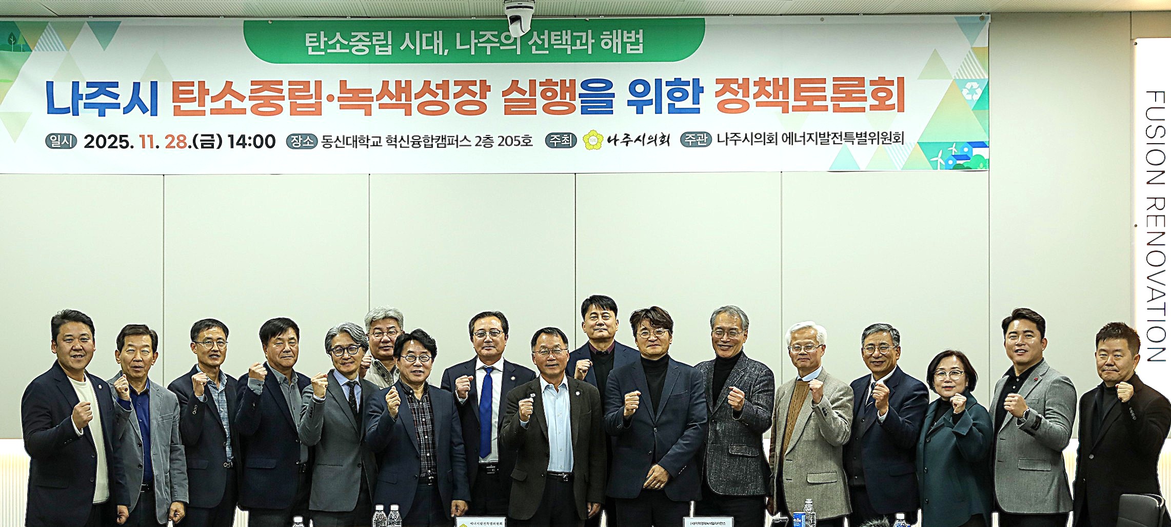 나주시의회(의장 이재남)는 지난 11월 28일 동신대학교 혁신융합캠퍼스에서 에너지발전특별위원회(위원장 김강정) 주관으로 「탄소중립·녹색성장 실행을 위한 정책토론회」를 성공적으로 개최했다.