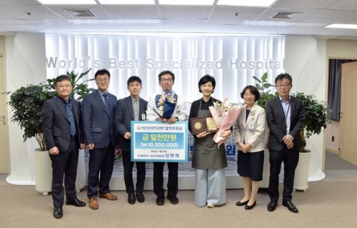 투썸플레이스 화순전남대병원점 김현희 대표(오른쪽에서 세 번째)가 민정준 병원장에게 후원금을 전달하고 행사 참...