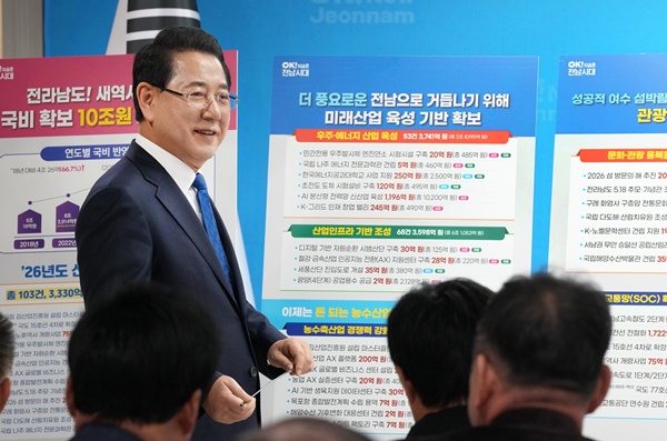 김영록 지사는 “AI 데이터센터, RE100 산단 조성, 민간 우주산업 선도사업, 전남형 농산업AX 등 다양한 분야에서 국비를 확보해 역대 최대인 국고 10조 원 시대를 활짝 열었다”며 “미래 전남 황금시대롤 힘차게 열기 위해 더욱 노력하겠다”고 강조했다.