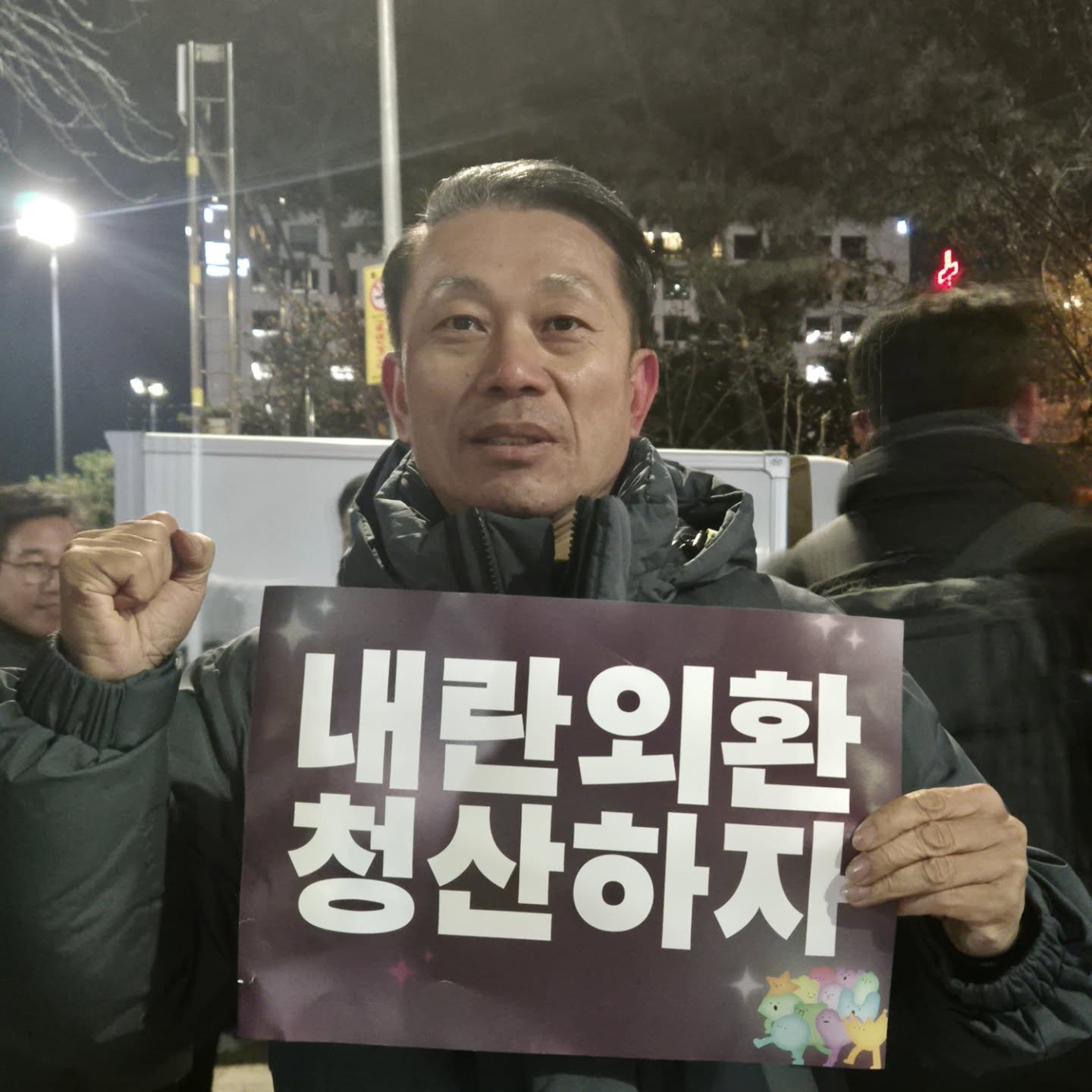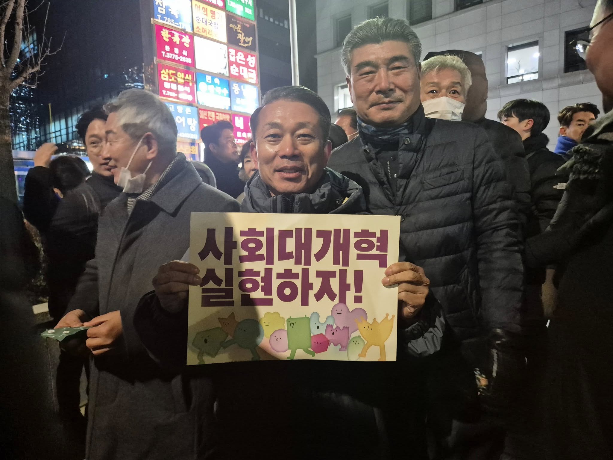 사진설명: 이재태,최명수 도의원과 도민들이 함께 모여 “내란외환 청산”과 “사회대개혁”을 외치며 민주주의 수호를 다짐하고 있다.