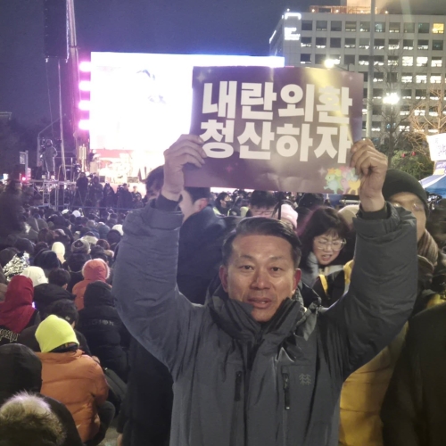 사진설명: 이재태,최명수 도의원과 도민들이 함께 모여 “내란외환 청산”과 “사회대개혁”을 외치며 민주주의 수...