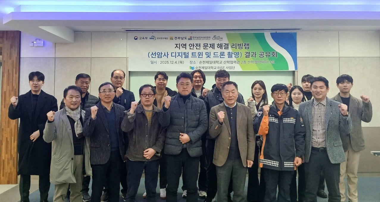 순천제일대학교(총장 성동제)는 전남도 지역혁신중심 대학지원(RISE) 사업 지역문제 해결형 리빙랩 과제인 '선암사 디지털 트윈 및 드론 촬영' 결과 공유회를 4일 교내 산학협력 세미나실에서 개최했다고 5일 밝혔다.
