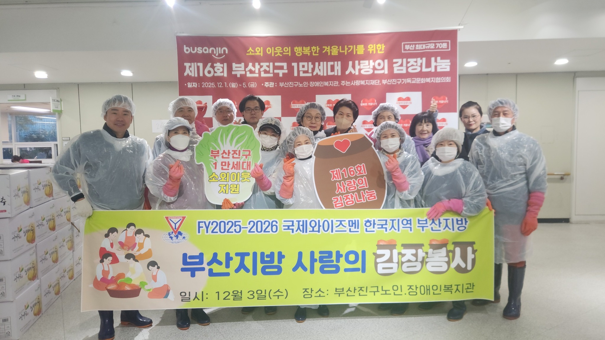 이번 김장봉사는 15년째 지속적으로 진행해 온 행사로 부산진구 노인·장애인 복지관이 주관하고 지역사회와 기업의 후원으로 지역의 노인 및 장애인 등 취약계층 1만세대에게 김장김치를 지원하는 부산 최대규모 (70톤)의 사업이다.
