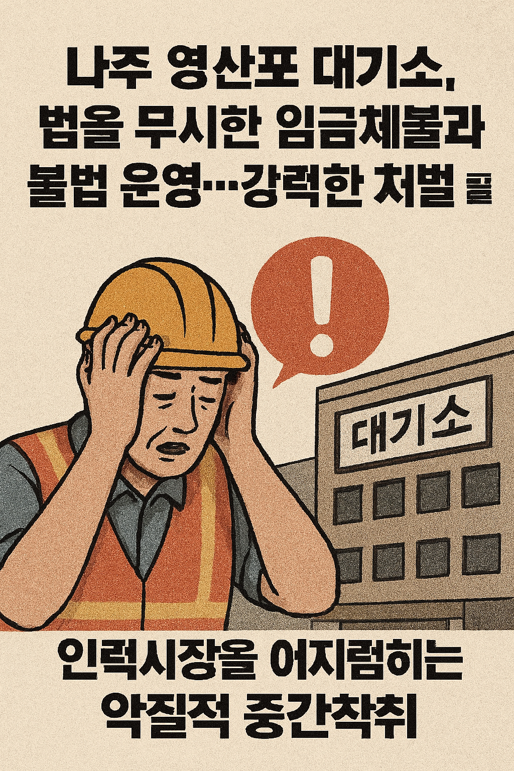 나주 영산포 A대기소 사장의 행위는 “인력시장을 어지럽히는 악질적 중간착취”다. 이는 단순한 민원 해결 수준을 넘어 형사처벌과 사업장 폐쇄가 불가피한 사안이다. 근로자의 땀과 눈물을 착취하는 직업소개소는 더 이상 지역사회에 발붙일 수 없어야 한다.