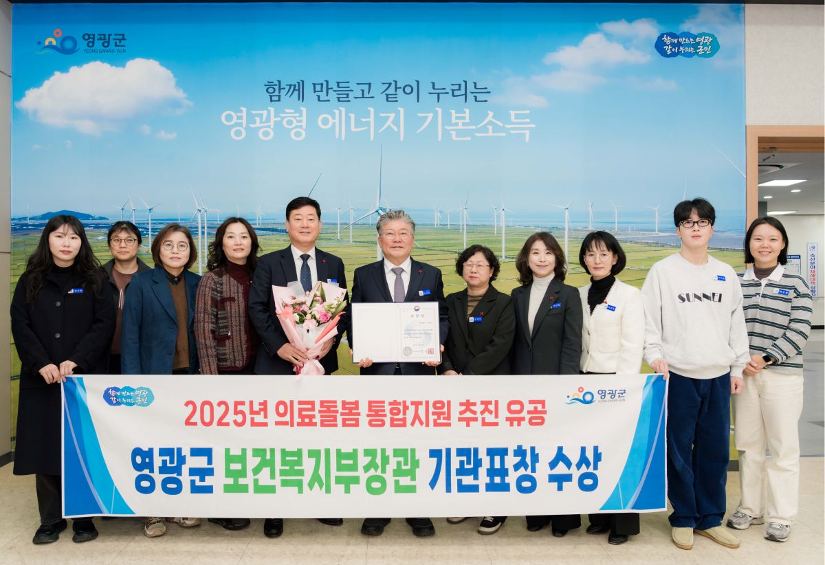 영광군이 보건복지부가 주관한 “2025년 의료·요양·돌봄 통합지원 성과대회”에서 유공기관으로 선정, 보건복지부 장관 표창을 수상했다. 이번 수상은 영광군이 지역사회 중심의 촘촘한 통합돌봄 체계를 구축하고, 민관 협력을 통해 다양한 맞춤형 서비스를 제공한 성과를 인정받은 결과다.