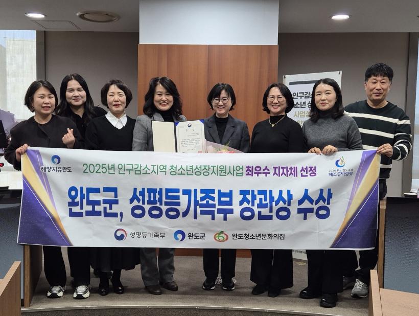 완도군이 ‘2025년 인구 감소 지역 청소년 성장 지원 사업’ 시행 첫해 최우수 지자체로 선정되어 성평등가족부 장관상을 수상했다.