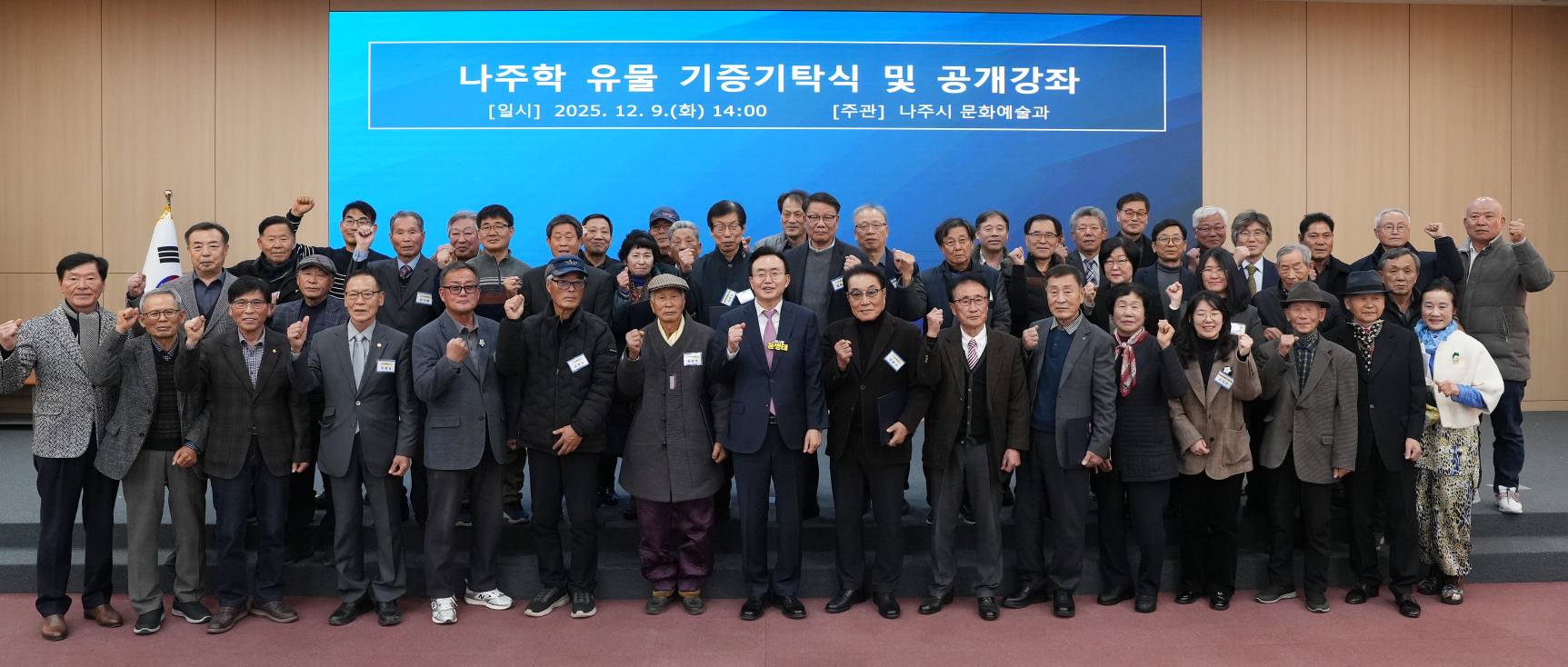 지난 9일 열린 ‘나주학 유물 기증·기탁식 및 공개강좌’에서 귀중한 사료를 기증·기탁한 시민들과 함께 기념촬영을 했다. 참석자들은 천년 목사고을 나주의 역사와 정신을 계승하고, ‘나주학’을 통해 새로운 미래를 열어가겠다는 다짐을 담아 주먹을 쥐고 환하게 웃었다.( 사진제공=나주시 뉴미디어팀)