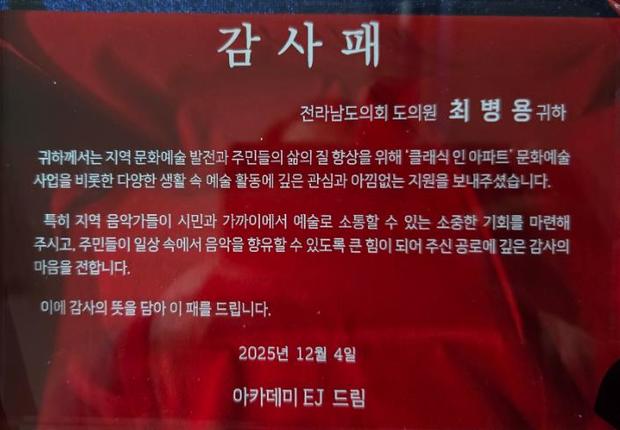 전라남도의회 최병용 의원(여수5, 더불어민주당)이 지역 문화예술 발전과 주민 삶의 질 향상에 기여한 공로를 인정받아 지난 4일 지역 예술교육 기관인 ‘아카데미 EJ(대표 이은주)’로부터 감사패를 수상했다.