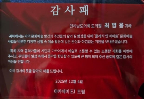 전라남도의회 최병용 의원(여수5, 더불어민주당)이 지역 문화예술 발전과 주민 삶의 질 향상에 기여한 공로를 ...
