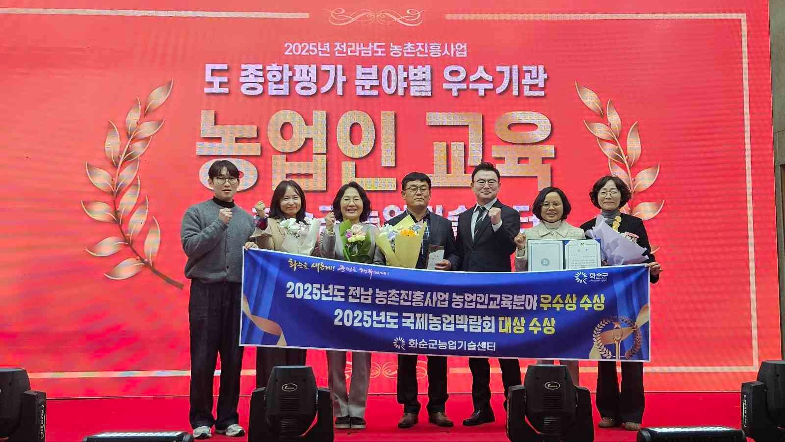 화순군 농업기술센터 직원들이 상패와 현수막을 들고 환하게 웃으며 기념 촬영을 하고 있는 모습(사진제공=화순군)