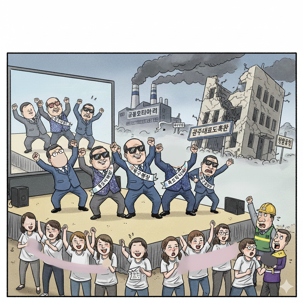 광주 자치구청장들은 이제라도 무너진 기강을 바로 세워라. 당직실에서 사라진 6급 사령, 무대 위에서 춤추는 고위직들, 그리고 현안을 외면하는 구청장들까지. 당신들이 시민을 외면할 때, 다음 심판의 대상은 바로 당신들이 될 것임을 명심해야 한다.