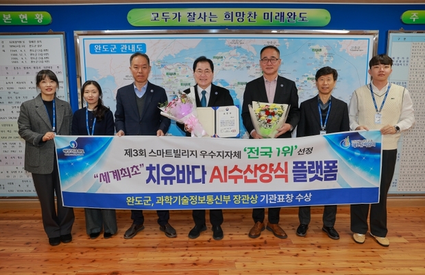 완도군의 ‘치유 바다 인공지능(AI) 수산양식 플랫폼’이 지난 10일 과학기술정보통신부 주관으로 열린'제3회 스마트 빌리지 보급 및 확산 사업 우수 사례 발표 대회'에서 전국의 수많은 사례를 제치고 1위로 선정되며 과학기술정보통신부 장관상을 수상했다.