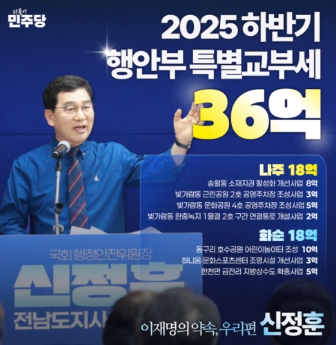신정훈 국회 행정안전위원장은 ( 전남 나주 · 화순 ) 은 15 일 행정안전부 특별교부세 총 36 억원을 확...
