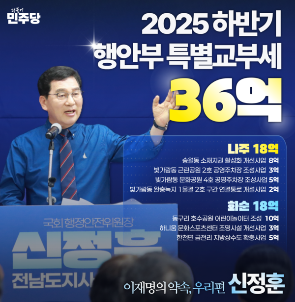 한편 신정훈 의원은 22 대 국회 들어 현재까지 행정안전부 특별교부세 총 175 억원을 확보하며 , 나주 · 화순 지역의 생활 SOC 확충과 주민 불편 해소를 위한 주요 현안 사업들을 꾸준히 챙기고 있다 .