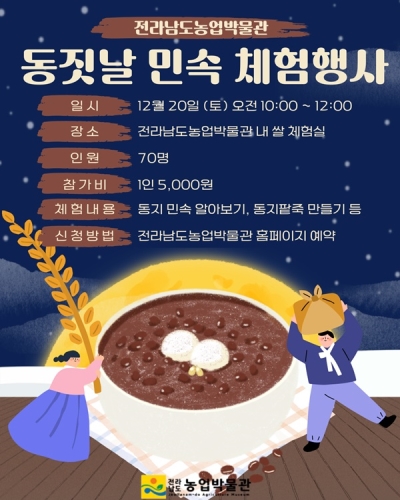 전라남도농업박물관은 잊혀가는 전통 절기 문화인 동짓날의 의미를 되새기기 위해 21일 오전 10시부터 12시까...