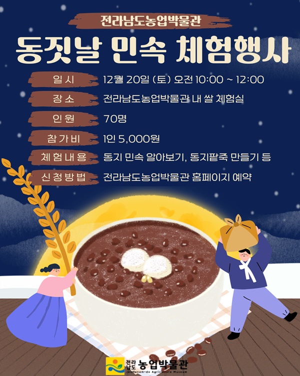 행사는 동짓날의 절기적 의미와 전통 민속을 소개하고, 동지팥죽을 만들어 보는 체험 중심 프로그램으로 구성됐다. 선착순 70명이며, 참가 신청은 전남도농업박물관 누리집(http://www.jam.go.kr)에 하면 된다. 참가비는 무료다.