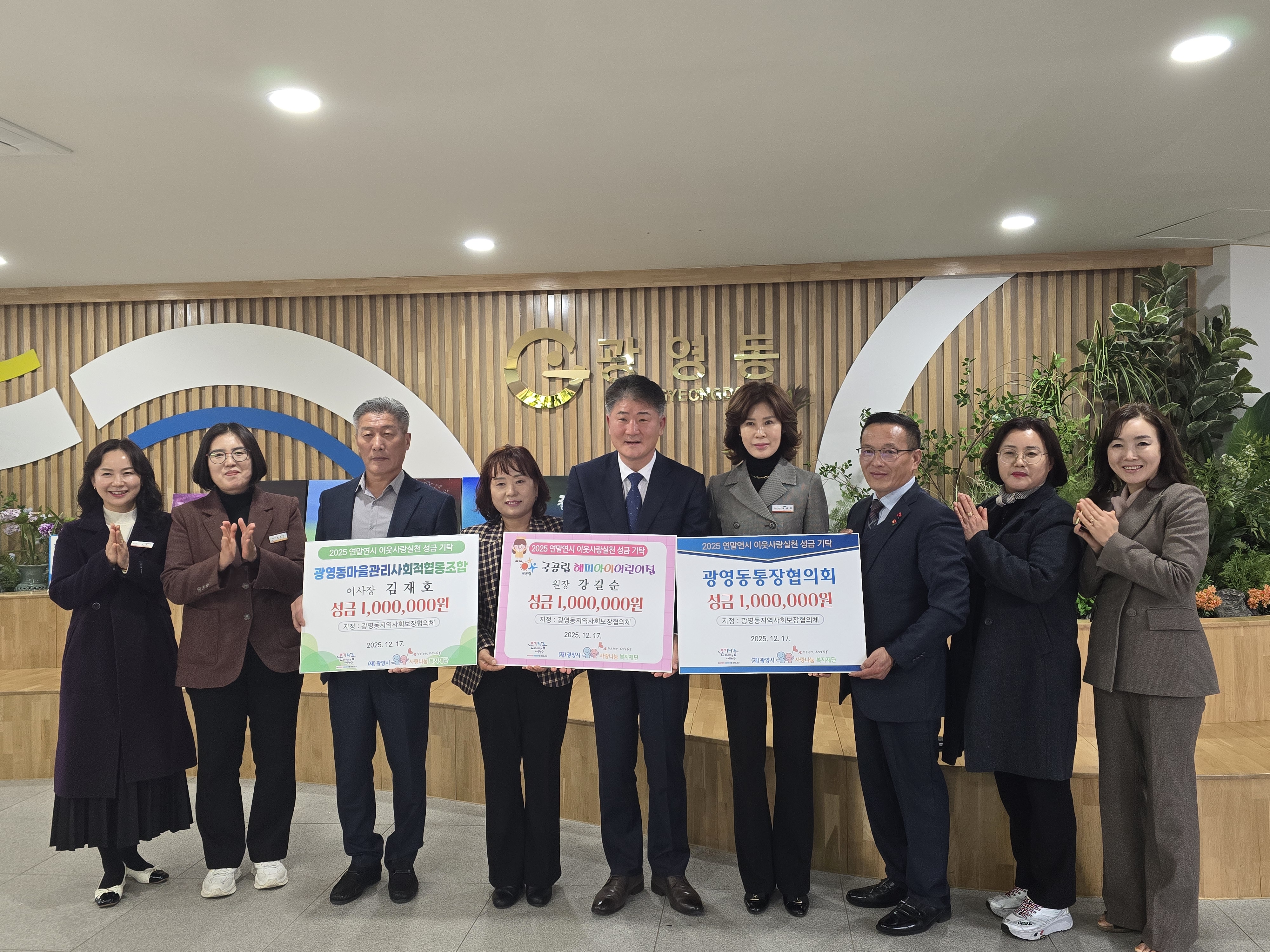 국공립 해피아이 어린이집 원장 강길순과 광영동통장협의회(회장 서정민) 광영동마을관리사회적협동조합 김재호 이사장은 금일2025년12월17일(수) 광영동사무소에서 지역사회를 위한 나눔실천의 일환으로 (재)광양시사랑나눔복지재단(이사장 김재경)에 성금 각 1,000,000원씩 총 3,000,000원의 성금을 전달하였다.