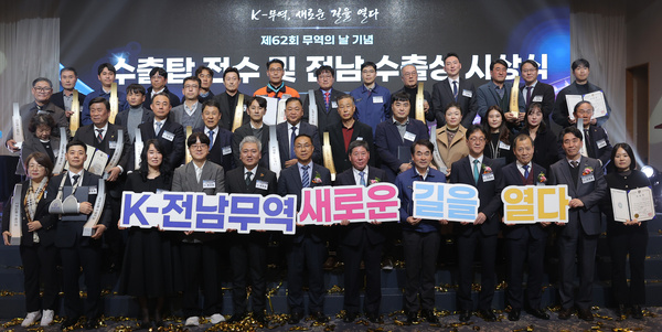 전라남도는 제62회 무역의 날을 기념해 수출탑 전수식과 전남 수출상 시상식을 지난 17일 호텔현대 바이 라한 목포에서 열어 전남 수출 성과를 공유하고 지속적인 수출 확대 방안을 모색했다.