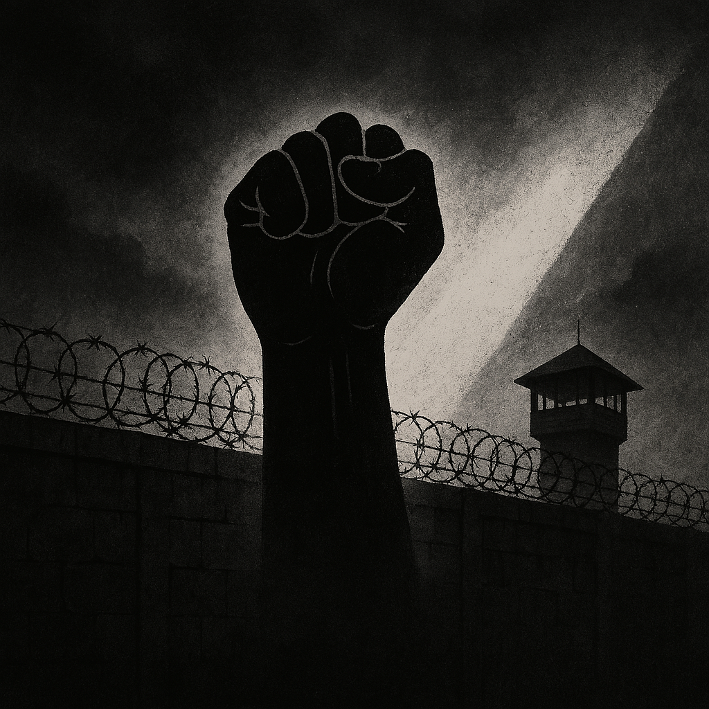 목포교도소 사건을 상징적으로 표현한 장면으로, 어두운 교도소 담장 뒤로 희미하게 빛이 스며들고, 인권을 상징하는 손이 힘차게 치켜 올라간 모습입니다.( 그림 조경수 기자)