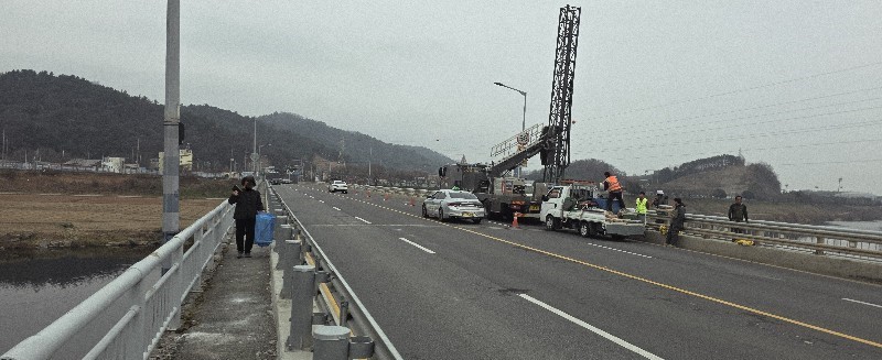 [해륙뉴스1 | 나주 이선희 시민기자] 영산포 대교에서 진행 중인 도로 보강 공사가 시민 안전을 위협하고 있다는 지적이 제기됐다. 현장에는 대형 장비와 작업 차량이 도로 위에 무질서하게 배치되어 있었지만, 운전자에게 이를 알리는 지시등, 유도 표지, 차로 통제 신호는 거의 전무한 상태였다.