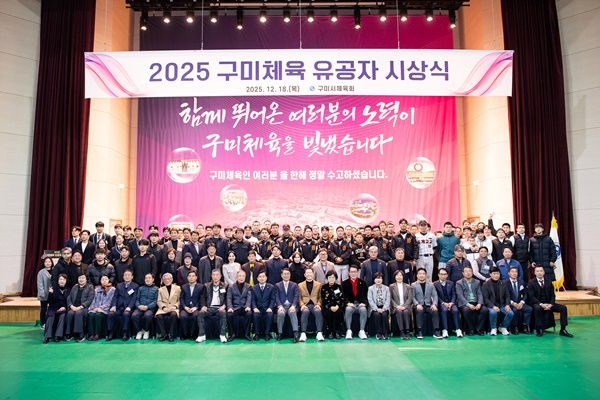 구미시는 지난 18일 복합스포츠센터 2층 다목적경기장에서 ‘2025년 구미체육 유공자 시상식’을 개최했다. 이날 행사에는 김장호 구미시장과 박교상 구미시의회 의장을 비롯해 체육인 400여 명이 참석했다.