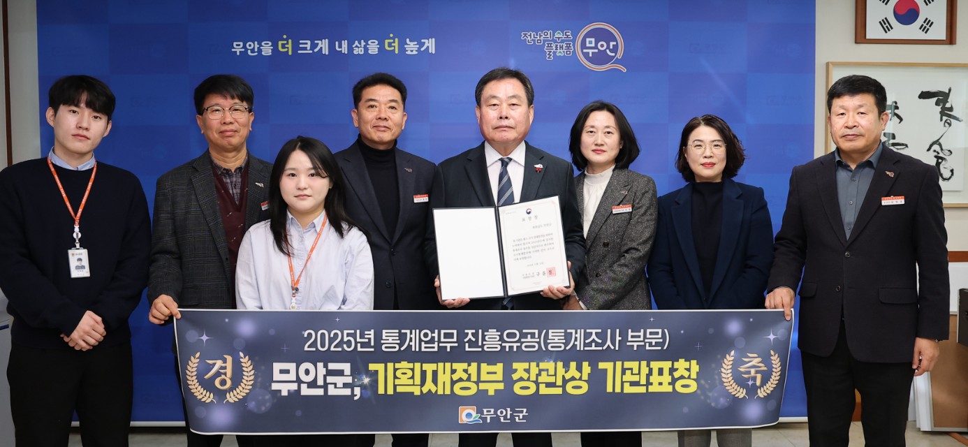 【무안=해륙뉴스1조경수 기자】 무안군이 국가통계 발전에 기여한 공로를 인정받아 ‘2025년 통계업무 진흥유공(통계조사 부문)’에서 기획재정부 장관상 기관표창을 수상했다.