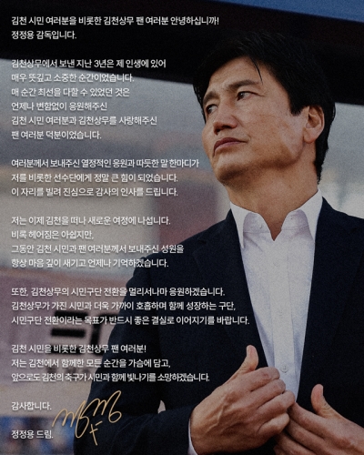 김천 시민 여러분을 비롯한 김천상무 팬 여러분 안녕하십니까! 정정용 감독입니다. 김천상무에서 보낸 지난 3년...