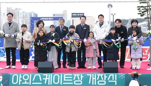 김영록 전라남도지사가 24일 도청 전남OK도민광장에서 열린 ‘야외 스케이트장 개장식’에서 주요 내빈 및 어린이들과 테이프 커팅을 하고 있다.