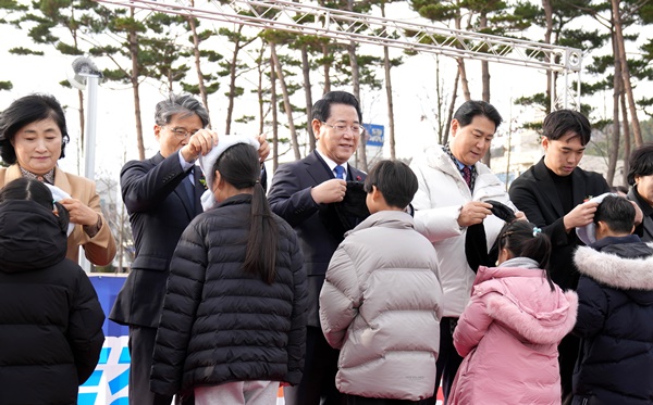 김영록 전라남도지사가 24일 도청 전남OK도민광장에서 열린 ‘야외 스케이트장 개장식’에서 주요 내빈들과 어린이들에게 목도리를 씌워주는 퍼포먼스를 하고 있다.