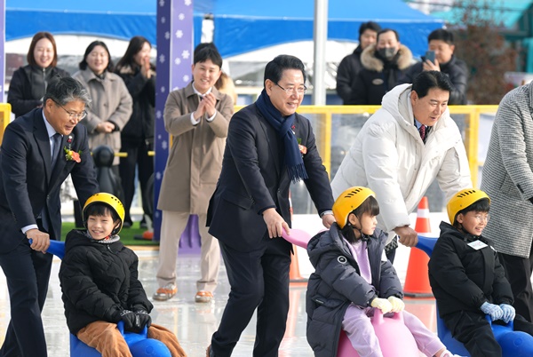 김영록 전라남도지사가 24일 도청 전남OK도민광장에서 열린 ‘야외 스케이트장 개장식’에서 주요 내빈 및 어린이들과 스케이트를 타고 기념촬영을 하고 있다.